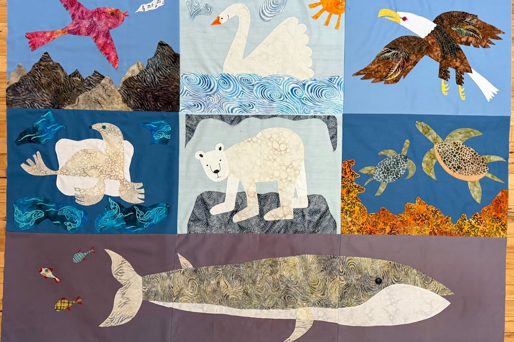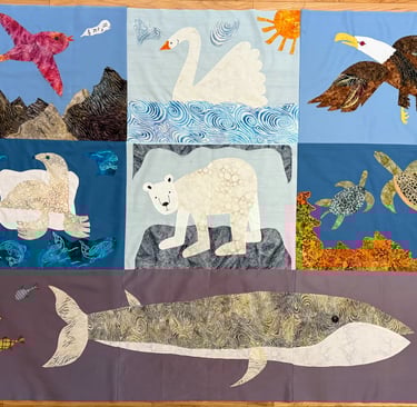 So, the swan took the center stage of my quilt and other animals of water and sky joined in. I took inspiration from the famous children’s book author and illustrator, Eric Carle and relied on my artistic daughter, Rachael, to refine my templates. These are seven animals that have issues with migration patterns, rising water temperatures, food scarcity and pollution, but. . .