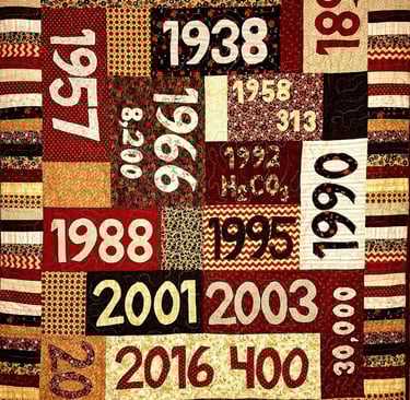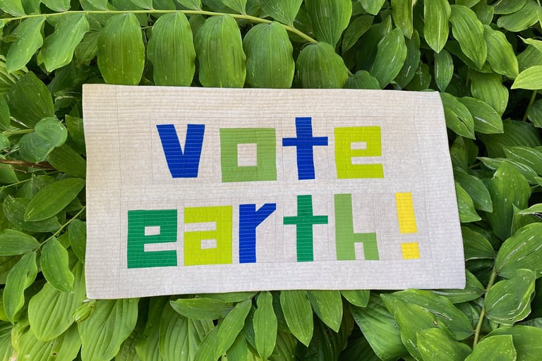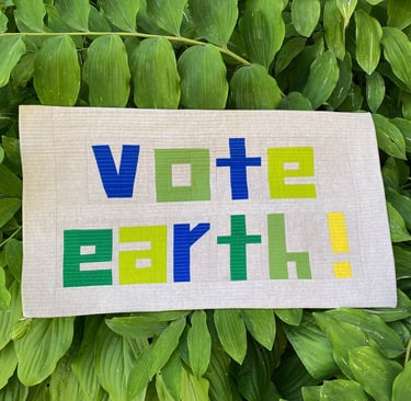 This quilt is a more traditional patchwork quilt made from 10"x10" squares with Climate Action Now done as an applique. Quilts, traditionally crafted from leftover fabric scraps, or worn-out clothing, and other discarded textiles, represent the concept of upcycling and transformation. For this display, the fabrics used have been donated, thrifted, and purchased from individuals who are “clearing out their stash.” We have avoided the use of fabric purchased at retail specifically for this project. This choice reflects our commitment to the zero-waste concept for climate change mitigation and emphasizes that what some may view as “trash” can be repurposed into both beautiful and functional items. In a world that often discards the old and the unwanted which contributes to overconsumption and pollution, we demonstrate that there is power in transformation.